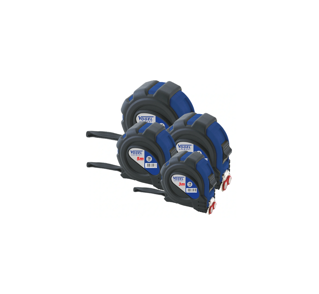 Cintas métricas de carcasa robusta, punta imantada, graduadas en mm y pulgadas.
